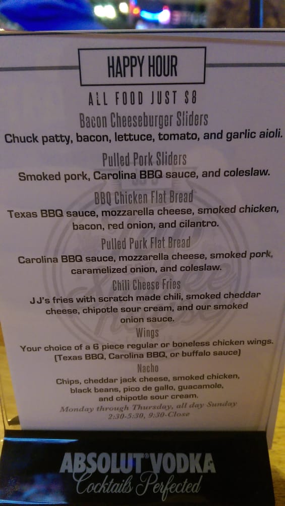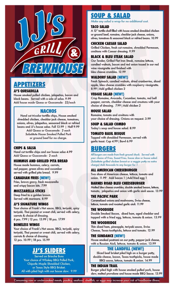 Introducing the menu at JJ’s Tap and Smokehouse, a neighborhood staple offering a mix of pub grub, fresh greens, and mouthwatering burgers. Their Pub Pretzel with beer cheese sauce and stone ground mustard is a perfect start, followed by the Black and Bleu salad with blackened sirloin and bleu cheese. For burger lovers, the Signature Chuck patty or The Strong Road with pulled pork and crispy onions are top choices. Customers praise their delicious ribs, amazing service, and family-friendly atmosphere. With daily specials and live music, JJ’s is a great spot for a relaxed night out. Try their sampler platter for a taste of everything or enjoy their famous brisket on the Ridgecrest burger. Overall, JJ’s Tap and Smokehouse delivers a delicious dining experience with a welcoming vibe.